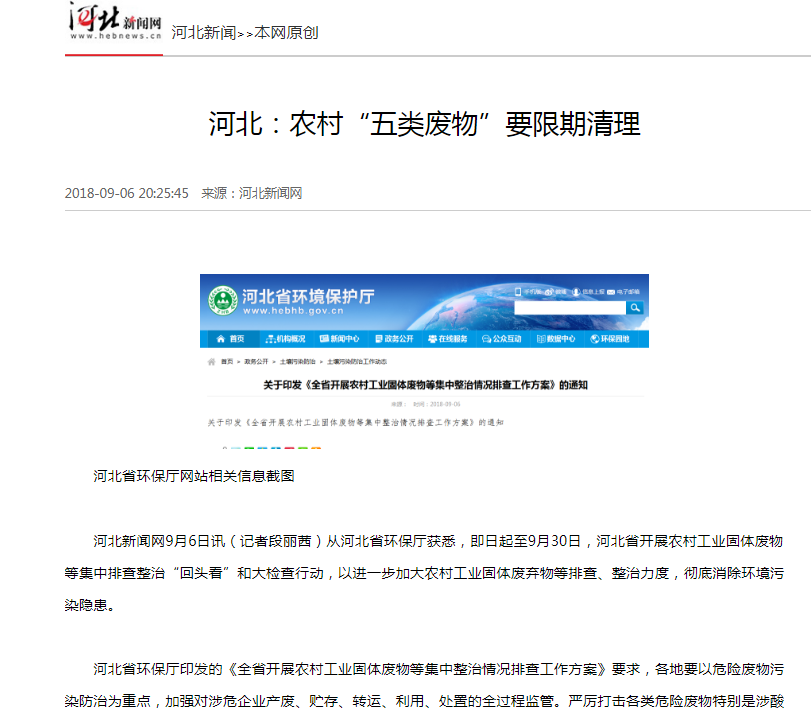 河北新闻网9月6日讯(记者段丽茜)从河北省环保厅获悉,即日起至9月30日,河北省开展农村工业固体废物等集中排查整治“回头看”和大检查行动,以进一步加大农村工业固体废弃物等排查、整治力度,彻底消除环境污染隐患。