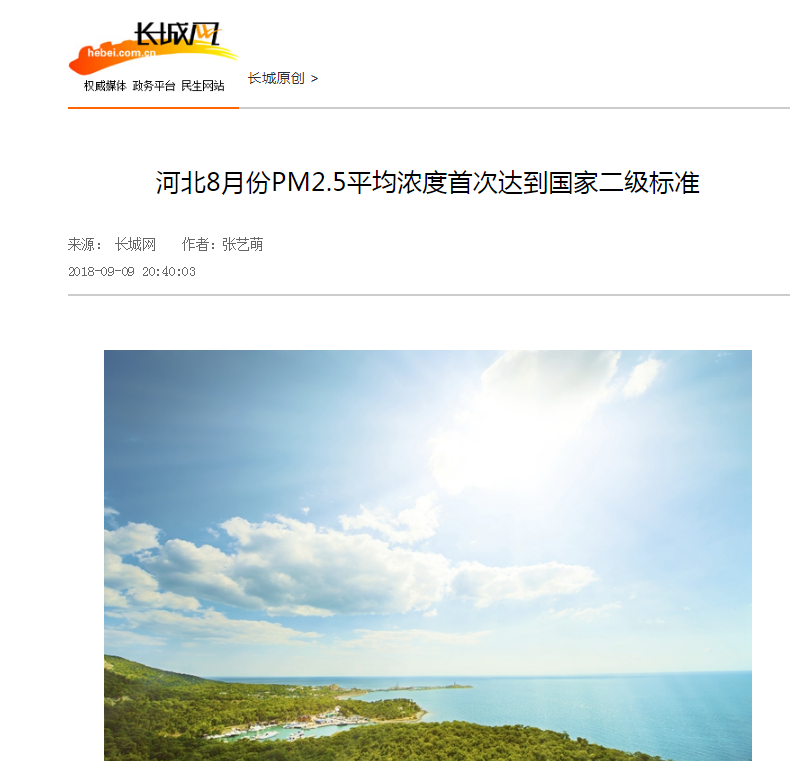 长城网:河北8月份PM2.5平均浓度首次达到国家二级标准