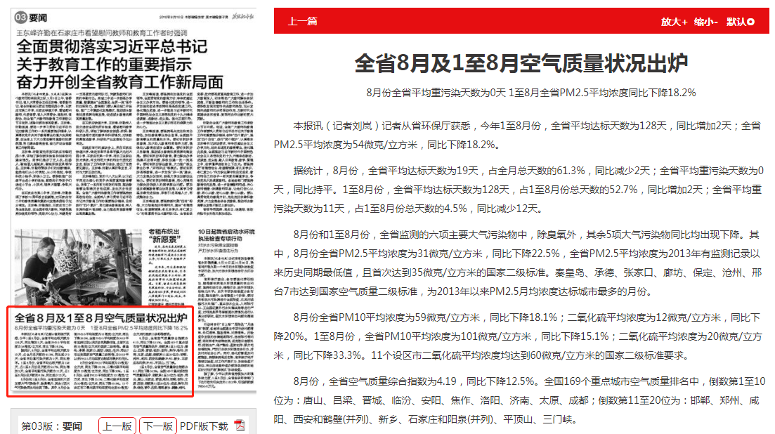 燕赵都市报:全省8月及1至8月空气质量状况出炉