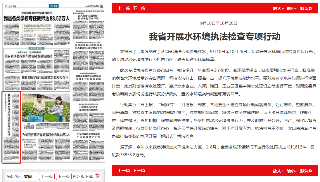 本报讯(记者段丽茜)从省环境综合执法局获悉,9月10日至10月26日,我省开展水环境执法检查专项行动,加大对涉水环境违法行为打击力度,改善我省水环境质量。