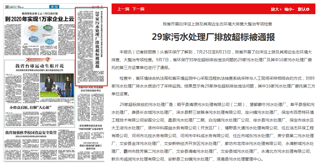 河北日报: 我省开展白洋淀上游及其周边生态环境大排查大整治专项检查 29家污水处理厂排放超标被通报