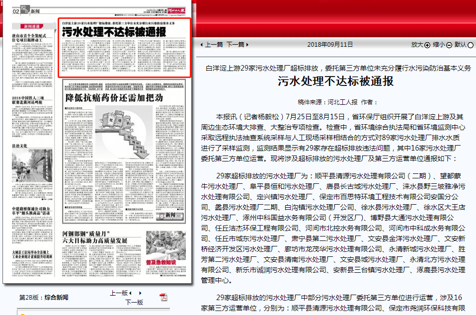 本报讯(记者杨毅松)7月25日至8月15日,省环保厅组织开展了白洋淀上游及其周边生态环境大排查、大整治专项检查。检查中,省环境综合执法局和省环境监测中心采取远程执法抽查系统采样与人工现场采样相结合的方式对89家污水处理厂排水水质进行了采样监测,监测结果显示有29家存在超标排放违法问题,其中16家污水处理厂委托第三方单位运营。现将涉及超标排放的污水处理厂及第三方运营单位通报如下: