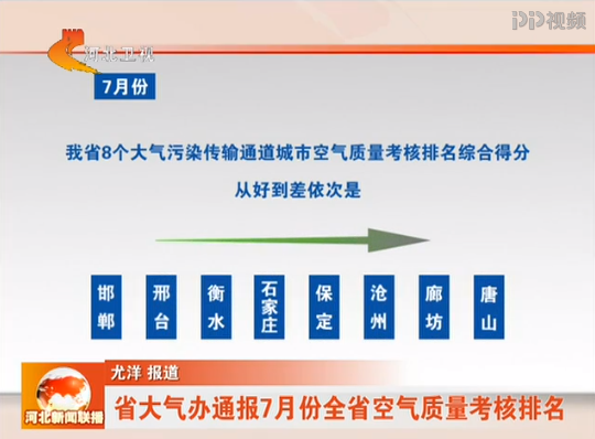 河北卫视《河北新闻联播》:省大气办通报7月份全省空气质量考核排名