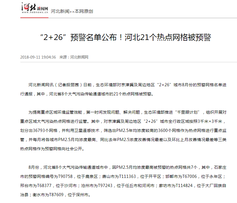 河北新闻网:“2+26”预警名单公布!河北21个热点网格被预警