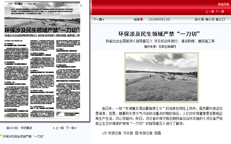 连日来,一则“京津冀及周边最强停工令”的消息在网络上热传。虽然最终被证实是谣言,但是,随着秋冬季大气污染防治重点时期的临近,人们对环保重拳是否影响正常生产生活,仍心存疑问。昨日,河北省环保厅就近期我省出台并实施的《河北省严格禁止生态环境保护领域“一刀切”的指导意见》进行了解读。