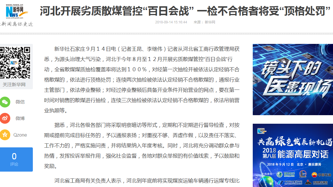 新华社:河北开展劣质散煤管控“百日会战” 一检不合格者将受“顶格处罚”