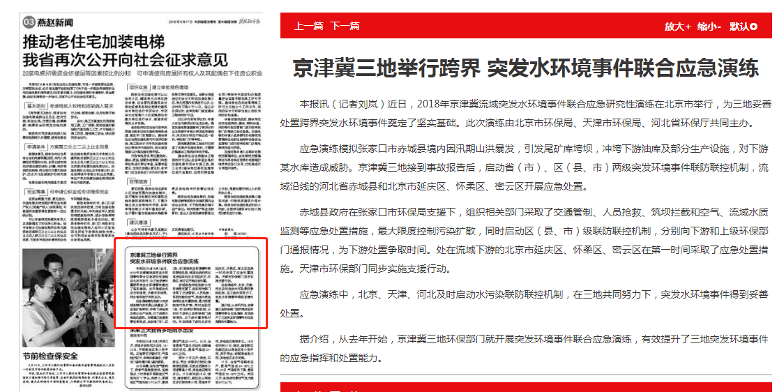 燕赵都市报;京津冀三地举行跨界 突发水环境事件联合应急演练