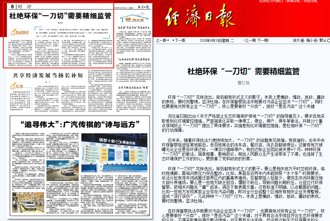 近年来,随着环保执法力度持续加大,“一刀切”的话题常见报端。有报道称,去年中央环保督察组进驻某地前后,老百姓常去的洗车店、餐饮店、洗衣店都被停业;还曾有地方被曝无论企业是否环保达标,一律实行错峰停产,有的达标企业因此被关停4个月。种种环保“一刀切”的做法,简单粗暴、影响恶劣,既给人民群众生产生活带来了不便,也违背了生态环境保护工作的初心,更损害了党和政府的形象。