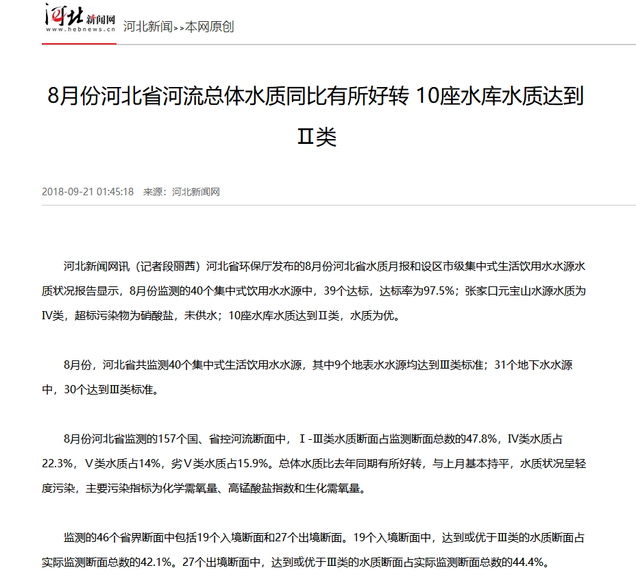 河北新闻网:8月份河北省河流总体水质同比有所好转 10座水库水质达到Ⅱ类