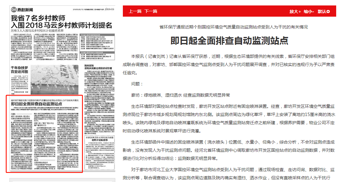 本报讯(记者刘岚)记者从省环保厅获悉,近期,根据杏彩提供的有关线索,省环保厅安排相关部门组成联合调查组,对廊坊、邯郸国控环境空气监测点受到人为干扰问题展开调查,并对已核实的违规行为予以严肃责任追究。