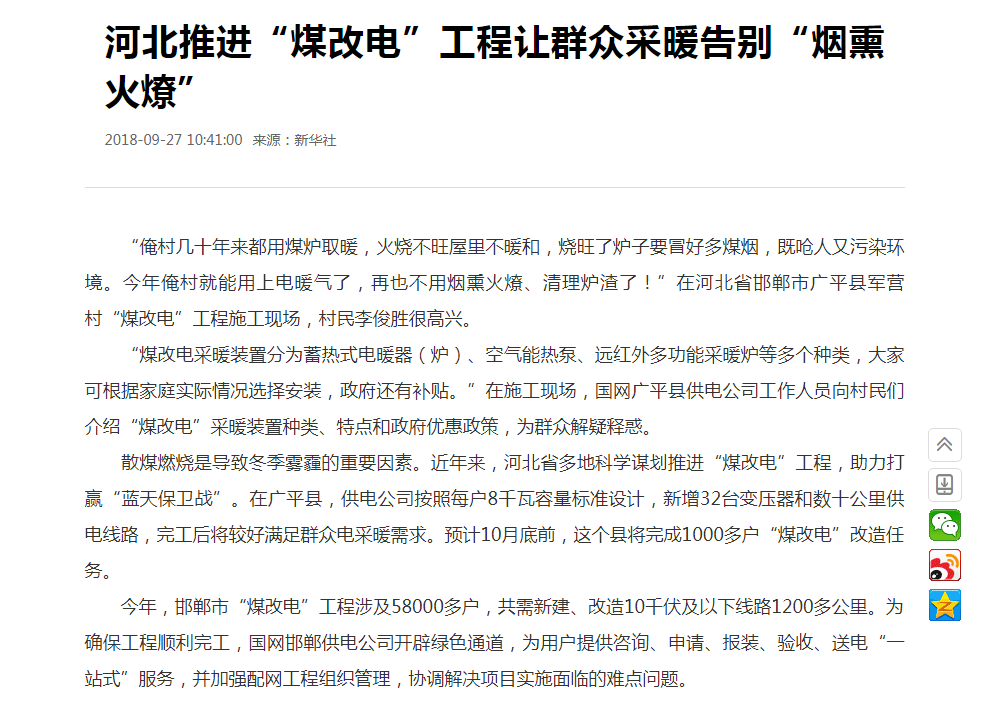 新华社:河北推进“煤改电”工程让群众采暖告别“烟熏火燎”