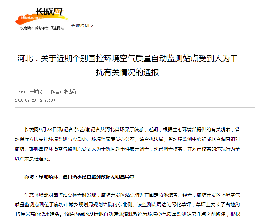 杏彩对国控站点检查时发现,廊坊开发区站点附近有固定喷淋装置。经查,廊坊开发区环境空气质量监测点现位于廊坊市城乡规划局规划馆院内东北侧。该监测点周边为绿化草坪,草坪上安装了离地约15厘米高的浇水喷头。该院内绿地及绿地自动喷淋灌溉系统为环境空气质量监测站房迁点之前所建,根据养护需要,物业公司不定时启动绿化喷淋系统对景观草坪进行浇灌。