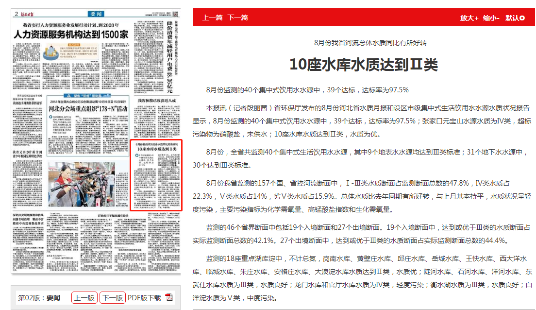 河北日报:8月份我省河流总体水质同比有所好转 10座水库水质达到Ⅱ类