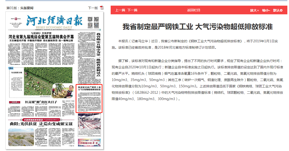 河北经济日报:我省制定最严钢铁工业 大气污染物超低排放标准