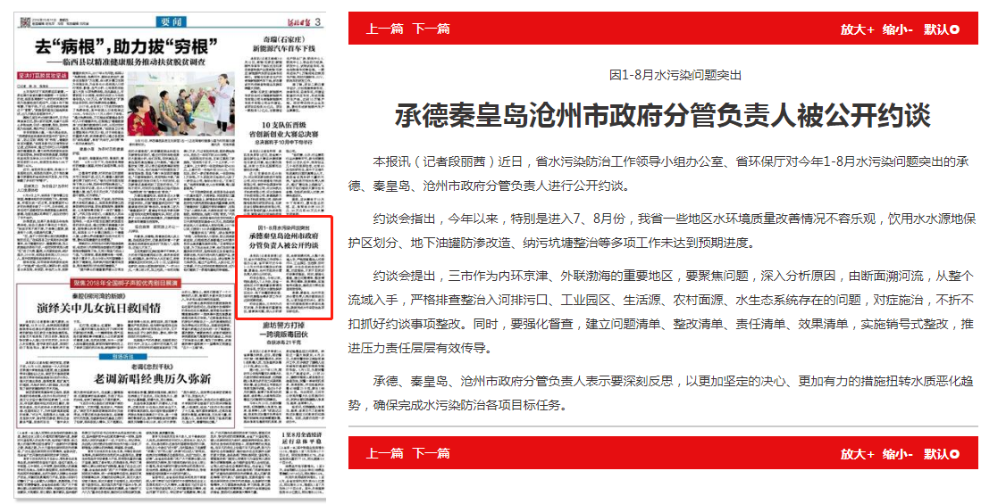 河北日报:因1-8月水污染问题突出 承德秦皇岛沧州市政府分管负责人被公开约谈