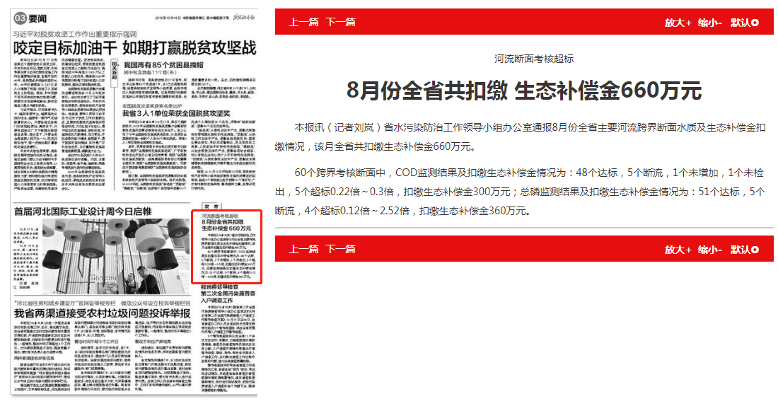 燕赵都市报: 河流断面考核超标 8月份全省共扣缴 生态补偿金660万元