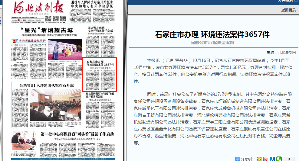 同时,该局向社会公布了近期查处的17起典型案例。其中有河北奇特包装有限责任公司违规设置监测设备参数案,石家庄市垣铄机械制造有限公司违法排污案,石家庄威望化工有限公司违法排污案,石家庄大成冀台机械有限公司违法排污案,石家庄海吉工贸有限公司违法排污案,河北博伦特药业有限公司违法排污案,石家庄天益机械制造有限公司违法排污案,石家庄新宇三阳实业有限公司伪造监测数据案,石家庄市藁城区金鑫焦化有限公司违反环评管理制度案,石家庄钢铁有限责任公司在线比对不合格、粉尘污染案,河北华电石家庄热电有限公司在线比对不合格、粉尘污染案等。