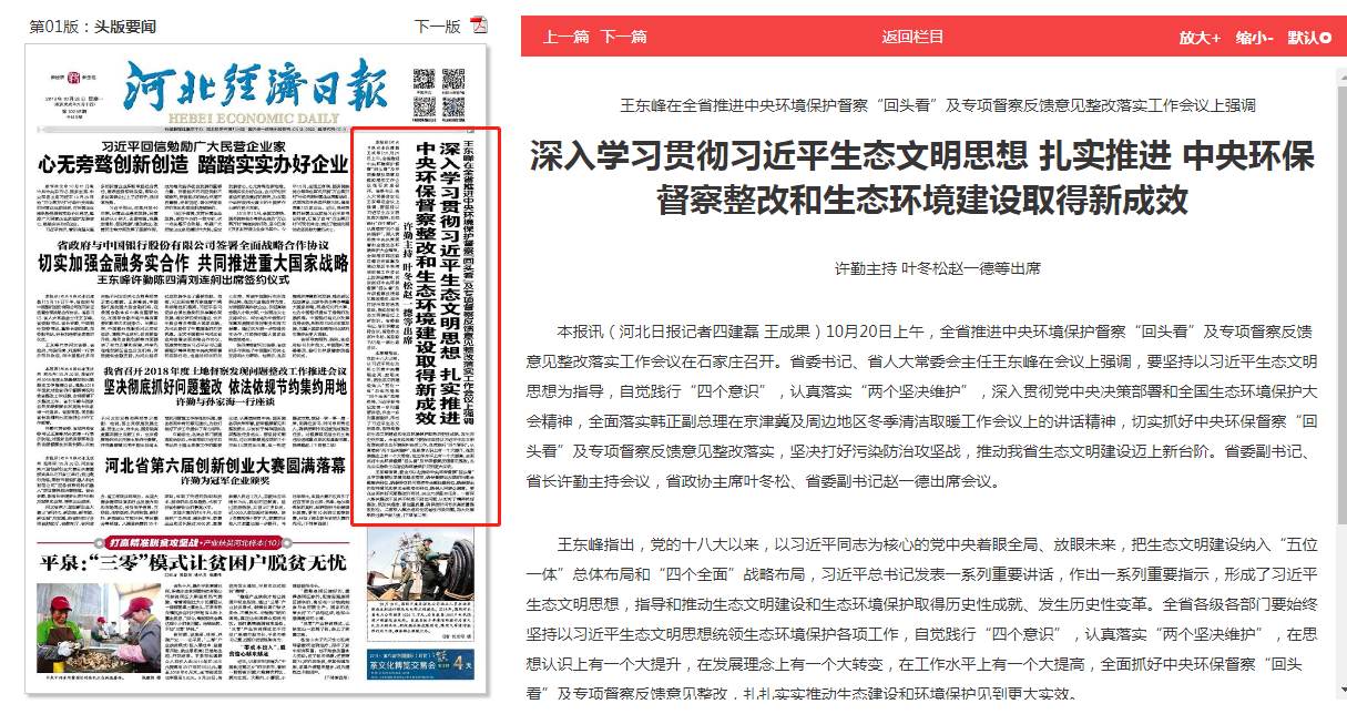 河北经济日报:深入学习贯彻习近平生态文明思想 扎实推进 中央环保督察整改和生态环境建设取得新成效