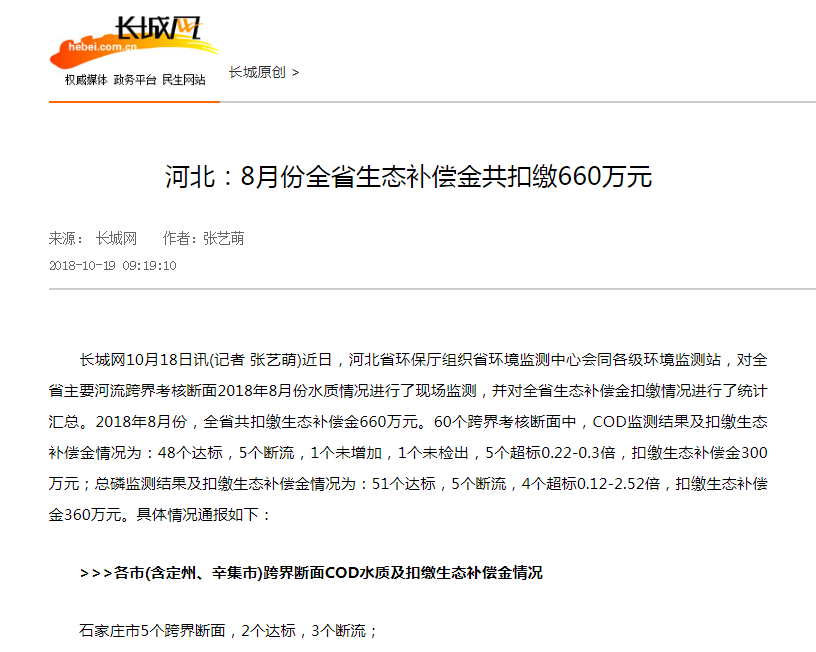 长城网:河北 8月份全省生态补偿金共扣缴660万元