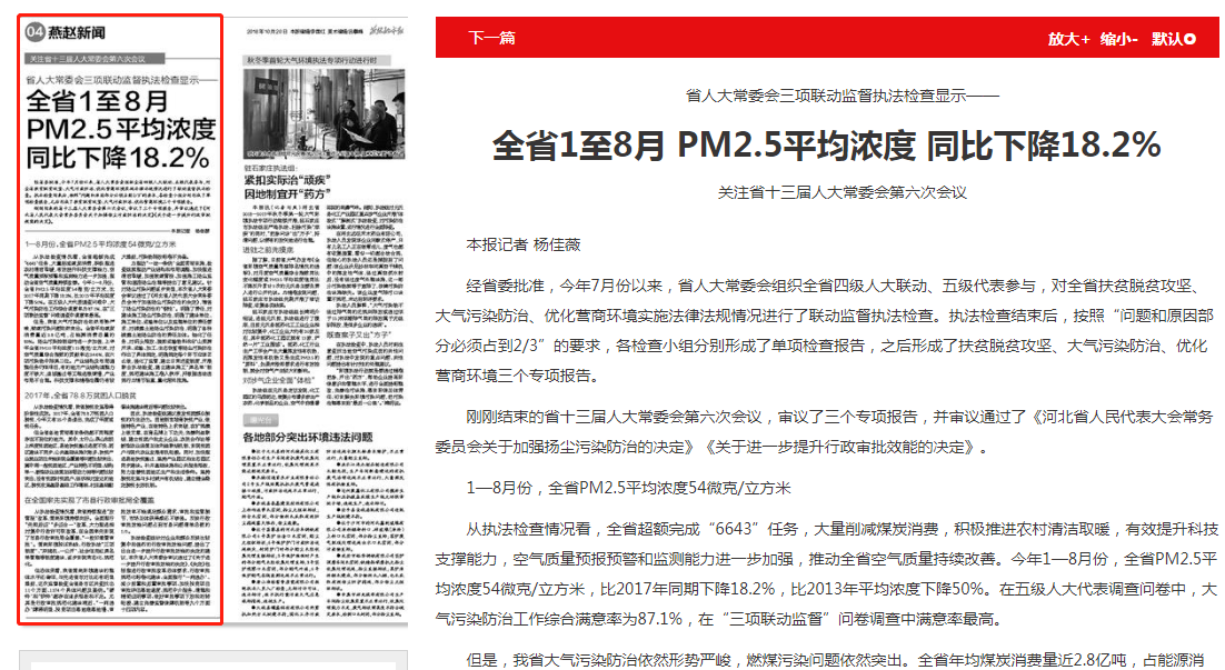 燕赵都市报: 省人大常委会三项联动监督执法检查显示——全省1至8月 PM2.5平均浓度 同比下降18.2%