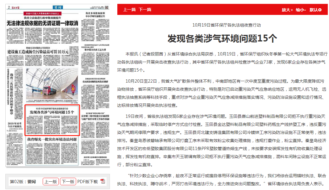 河北日报:10月19日省环保厅各执法组夜查行动 发现各类涉气环境问题15个