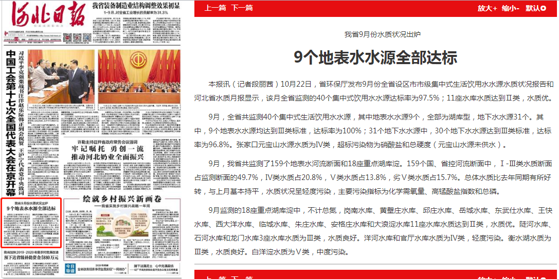 河北日报: 我省9月份水质状况出炉 9个地表水水源全部达标