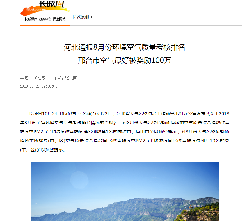 长城网:河北通报8月份环境空气质量考核排名 邢台市空气最好被奖励100万