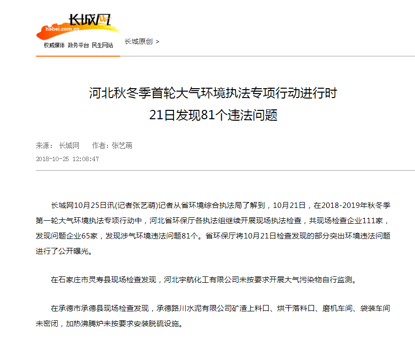 长城网:河北秋冬季首轮大气环境执法专项行动进行时 21日发现81个违法问题