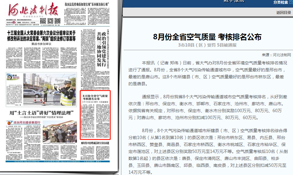 河北法制报:8月份全省空气质量 考核排名公布 3市10县(区)受罚 5县被通报