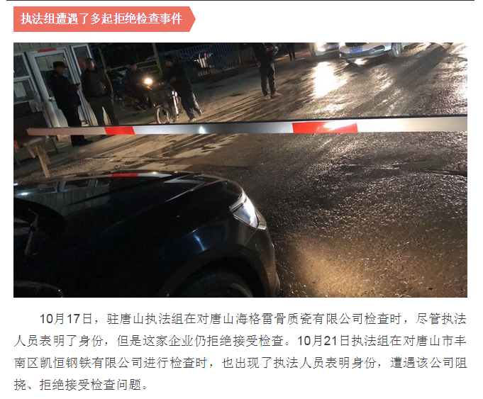 10月17日,驻唐山执法组在对唐山海格雷骨质瓷有限公司检查时,尽管执法人员表明了身份,但是这家企业仍拒绝接受检查。