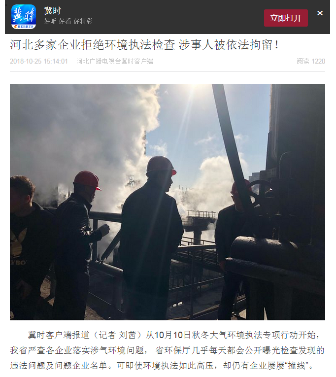 秋冬季环保执法专项行动启动以来,河北严查各企业落实情况及其涉气环境问题。高压之下,仍有企业屡屡“撞线”,执法组遭遇多起拒绝检查事件。