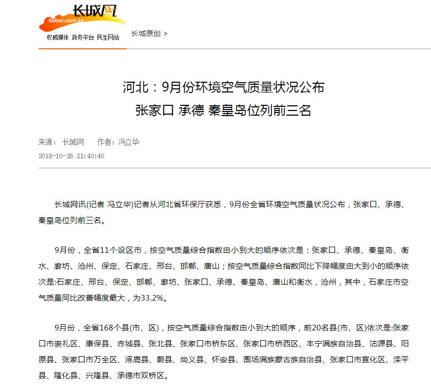长城网:河北 9月份环境空气质量状况公布 张家口 承德 秦皇岛位列前三名