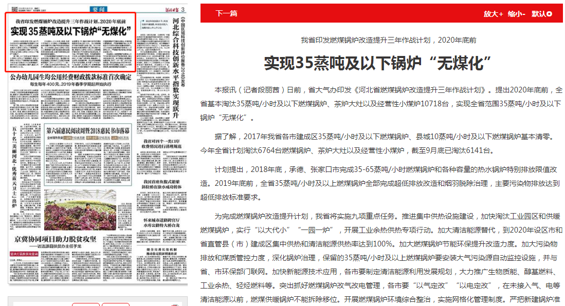 河北日报: 我省印发燃煤锅炉改造提升三年作战计划,2020年底前实现35蒸吨及以下锅炉“无煤化”