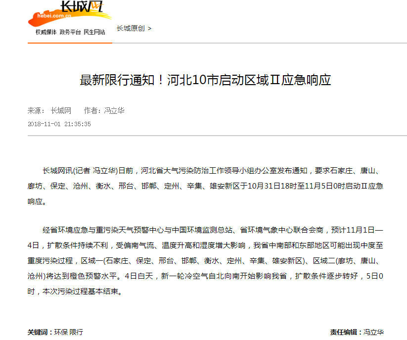 长城网:最新限行通知!河北10市启动区域Ⅱ应急响应