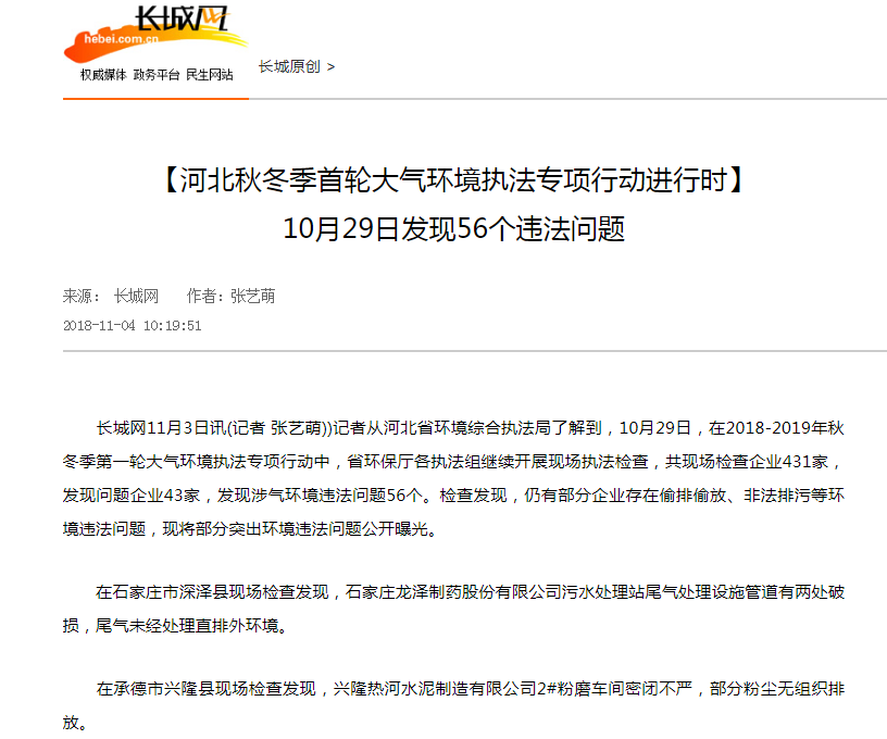 长城网:【河北秋冬季首轮大气环境执法专项行动进行时】10月29日发现56个违法问题