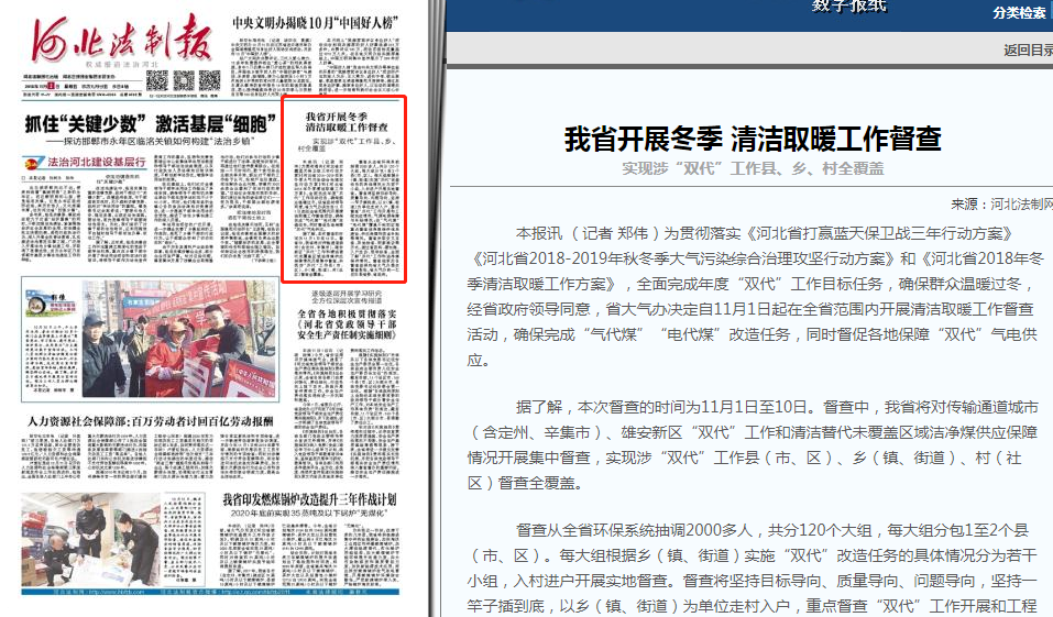 河北法制报:我省开展冬季 清洁取暖工作督查 实现涉“双代”工作县、乡、村全覆盖