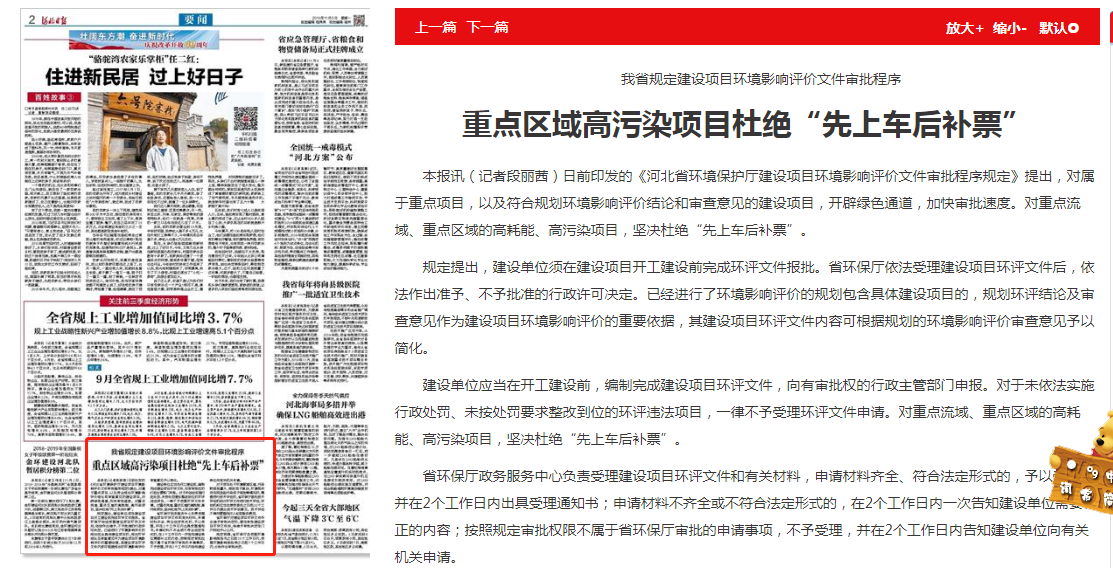河北日报: 我省规定建设项目环境影响评价文件审批程序 重点区域高污染项目杜绝“先上车后补票”
