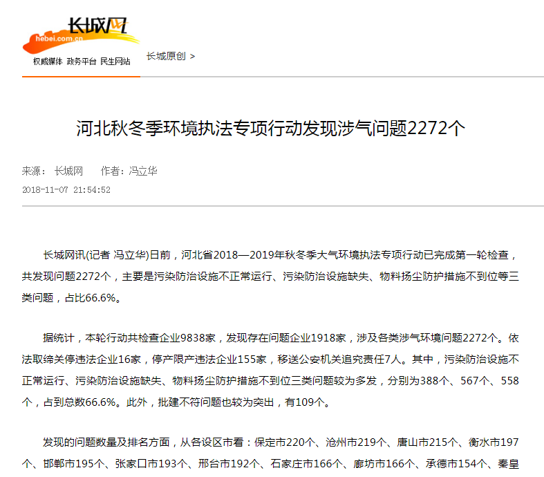 长城网:河北秋冬季环境执法专项行动发现涉气问题2272个