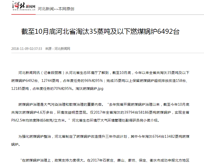 河北新闻网:截至10月底河北省淘汰35蒸吨及以下燃煤锅炉6492台