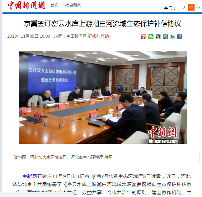据了解,密云水库上游潮白河流域水源涵养区是京冀水源涵养功能区的重要组成部分,建立流域生态补偿机制是大力实施京津冀协同发展战略的重要内容。