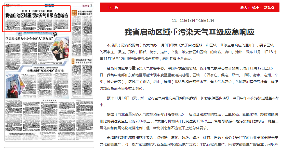河北日报:11月11日18时至16日12时 我省启动区域重污染天气Ⅱ级应急响应