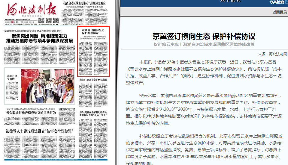 密云水库上游潮白河流域水源涵养区是京冀水源涵养功能区的重要组成部分,建立流域生态补偿机制是大力实施京津冀协同发展战略的重要内容。补偿协议商定,协议实施年限暂定为2018至2020年,考核依据为水量、水质、上游行为管控三方面。相对以往以跨境考核断面水质情况作为考核依据的做法,该补偿协议拓展了水源地生态保护补偿的内涵。