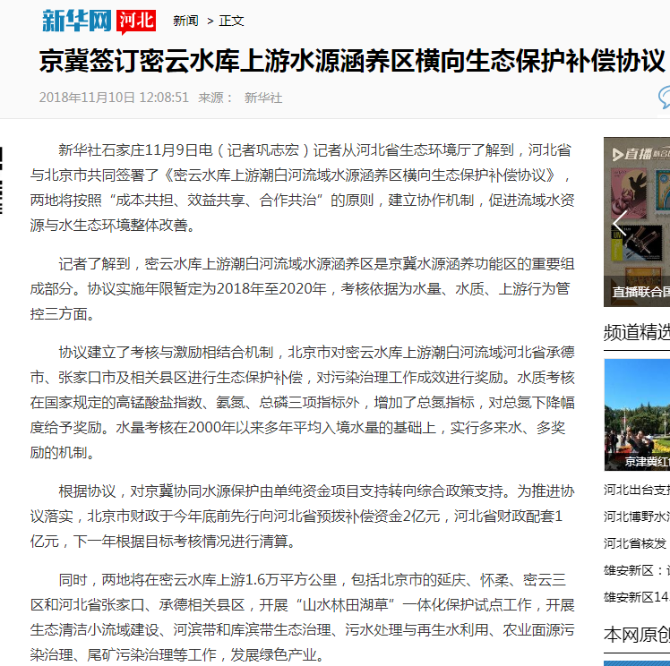 了解到,河北省与北京市共同签署了《密云水库上游潮白河流域水源涵养区横向生态保护补偿协议》,两地将按照“成本共担、效益共享、合作共治”的原则,建立协作机制,促进流域水资源与水生态环境整体改善。