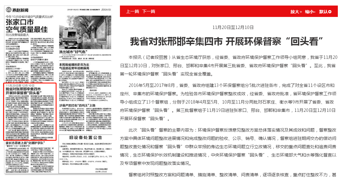 燕赵都市报:11月20日至12月10日 我省对张邢邯辛集四市 开展环保督察“回头看”