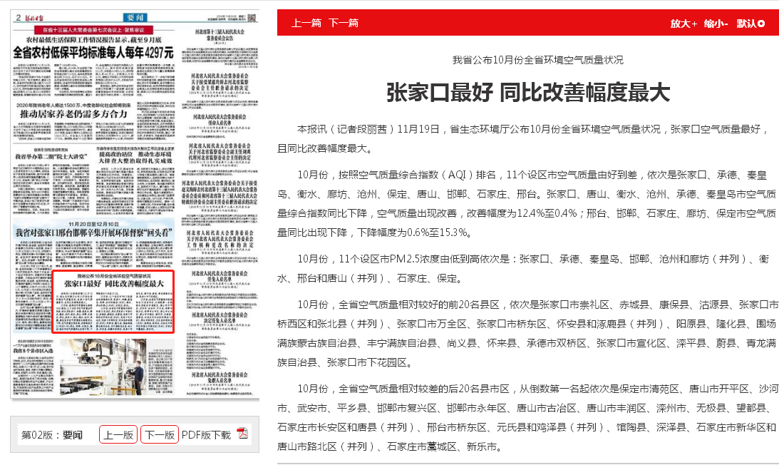 河北日报:我省公布10月份全省环境空气质量状况 张家口最好 同比改善幅度最大