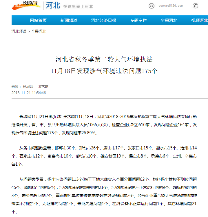 长城网:河北省秋冬季第二轮大气环境执法 11月18日发现涉气环境违法问题175个