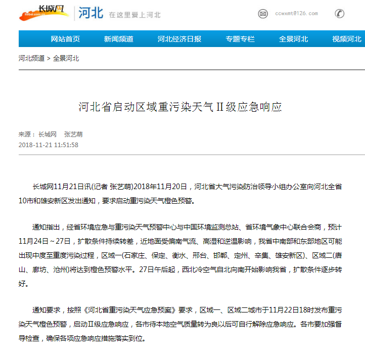长城网11月21日讯(记者 张艺萌)2018年11月20日,河北省大气污染防治领导小组办公室向河北全省10市和雄安新区发出通知,要求启动重污染天气橙色预警。