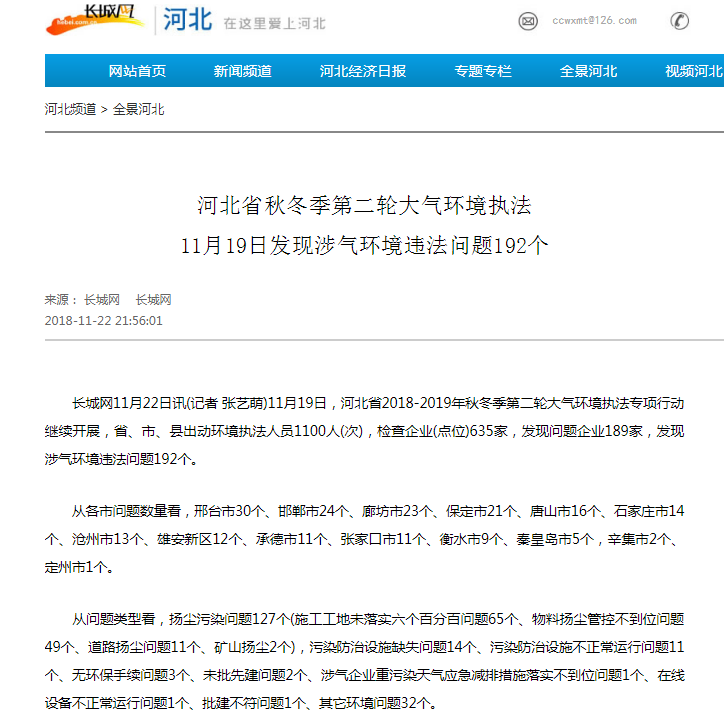 长城网:河北省秋冬季第二轮大气环境执法 11月19日发现涉气环境违法问题192个