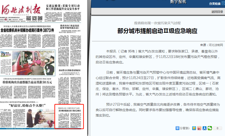 河北法制报:我省将出现一次重污染天气过程 部分城市提前启动Ⅱ级应急响应