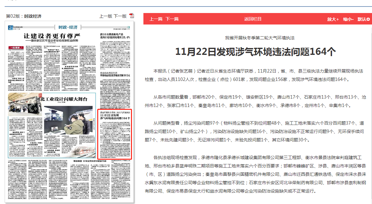 河北经济日报:11月22日发现涉气环境违法问题164个